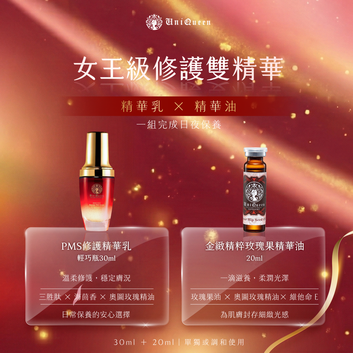 建議搭配:建議將PMS修護精華乳與金緻精粹玫瑰果精華油以 1:1 調和使用,油水協同保養,幫助肌膚更穩定、更柔潤,展現自然透亮膚質。